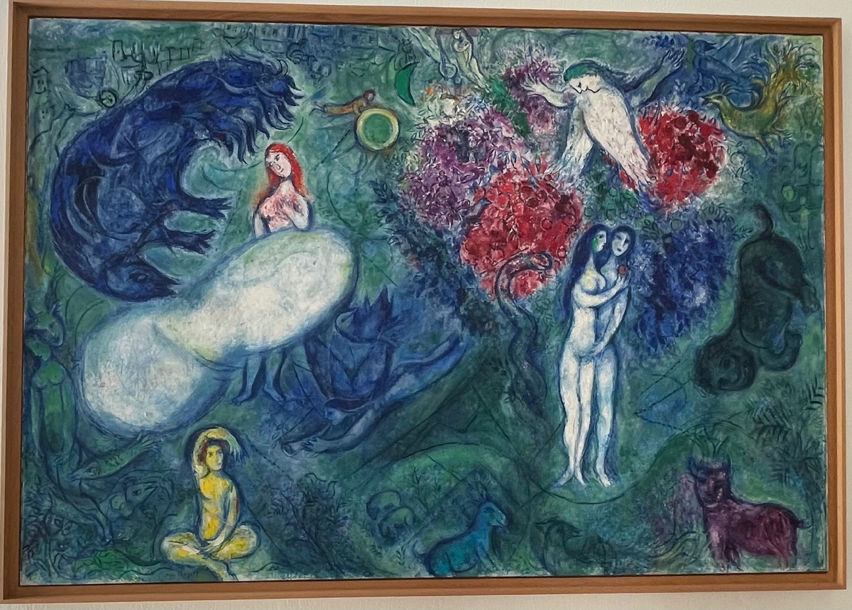 Марк Шагал, «Рай», 1961, масло на холсте, 198 × 288 см, Национальный музей Марка Шагала, Ницца. Рай вызывает у Шагала представление о месте интимного единения всех существ творения — людей, животных и многочисленных гибридных фигур, живущих в гармонии среди пышной растительности и вод, подчеркнутых зелёными и голубыми тонами. Тщательное распределение цветовых масс придаёт композиции равновесие. Картина, задуманная как диптих, изображает сотворение Евы и искушение. Слева, над Адамом, сидящим по-турецки и поднимающим руку, словно облегчая доступ к своему ребру, Бог представлен в виде белого облака — своеобразного таинственного кокона, подчёркивающего чудо творения, из которого появляется Ева с застенчивым жестом. Справа — перво-чета, слившаяся в одно целое, с двумя руками и тремя ногами, как это часто изображал Шагал, готовится вкусить запретный плод с древа познания добра и зла, который сделает их равными Богу.