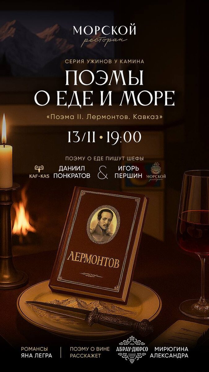 «Поэмы о еде и море. Лермонтов. Кавказ. Диалог вкусов и смыслов» 13 ноября | 19:00 Ресторан «Морской» приглашает на второй вечер из гастрономической серии «Поэмы о еде и море» — ужин, вдохновлённый личностью Михаила Юрьевича Лермонтова и его вечным диалогом с Кавказом. Эта встреча — не просто о вкусах. Это разговор культур, характеров и чувств: русская душа, ищущая смысл и свободу, соединяется с темпераментом Кавказа — гордого, страстного и поэтичного. В программе: • Ужин в четыре руки: шефы Игорь Першин («Морской») и Даниил Понкратов (Kaf-Kas) создадут меню на стыке русской и кавказской кухни. Каждое блюдо — это метафора и глава общей поэмы. • Винное сопровождение от Абрау-Дюрсо: Бренд-амбассадор Александра Мирюгина лично представит изысканные винные пары, которые раскроют вкус и замысел шефов. • Романсы у камина: живой вокал Яны Легра. В этот вечер «Морской» вновь объединит море, поэзию и гастрономию — чтобы пробудить чувства, вдохновить и напомнить, что еда тоже может быть ис