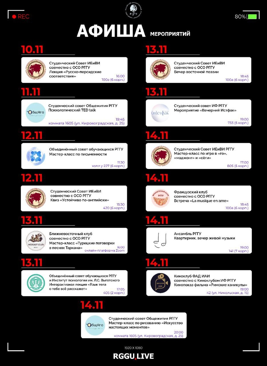 🥳 Афиша предстоящих мероприятий 📢 Студенческий Совет ИЕиВИ совместно с ОСО РГГУ организуют лекцию «Русско-персидские соответствия» 📌 10.11/ 16:00/ 100а (6 корп.) Подробнее здесь 👈 📢 Студенческий совет Общежития РГГУ проводит психологический TED talk 📌 11.11/ 19:45/ 1605 комната (ул. Кировоградская, д. 25) Подробнее здесь 👈 📢 Объединённый совет обучающихся РГГУ ждёт на мастер-классе по письменности 📌 12.11/ 11:30/ холл у 227 (6 корп.) Подробнее здесь 👈 📢 Студенческий Совет ИЕиВИ совместно с ОСО РГГУ предлагают принять участие в квизе «Устойчиво по-английски» 📌 12.11/ 15:30/ 420 (6 корп.) Подробнее здесь 👈 📢 Ближневосточный клуб совместно с ОСО РГГУ проводят мастер-класс «Турецкие поговорки в песнях Таркана» 📌 13.11/ 16:00/ Онлайн-платформа Zoom Подробнее здесь 👈 📢 Объединённый совет обучающихся РГГУ совместно с Институтом психологии им. Л.С. Выготского организуют интерактивную лекцию «Язык тела о тебе всё расскажет» 📌 13.11/ 17:05/ 405 (2 корп.) Подробнее здесь ?