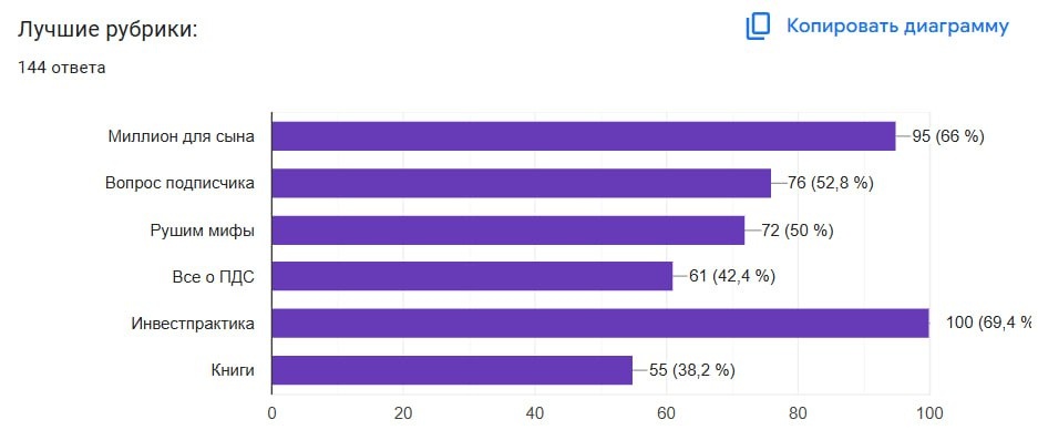 Уже 144 человека прошли опрос. Неожиданно для меня "Инвестпрактика" лидирует в голосовании за лучшую рубрику. Многие ваши ответы удивляют, заставляют задуматься, вдохновляют, радуют. На критику обижаться даже не собираюсь. Конструктивные пожелания и замечания обязательно учту. Все они очень ценны и полезны, так как мои собственные представления, как оказалось, серьезно отличаются от ваших мнений. А со стороны многое виднее... ❗️ОПРОС ПРОДОЛЖАЕТСЯ 👈