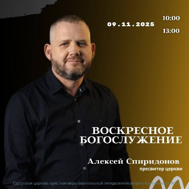 Добро пожаловать на воскресное Богослужение! 📅 09.11.2025 🟡10:00 🟡13:00 📍Сургут, пр-т Комсомольский 24 📎 Алексей Спиридонов ✝️online трансляции не будет, ждем вас offline. Обратите внимание ➡️ Время служения 10:00 - общецерковное и детское служение. 13:00 - общецерковное и подростковое служение. Rutube канал ВК страница церкви Не забудьте подписаться ✍️