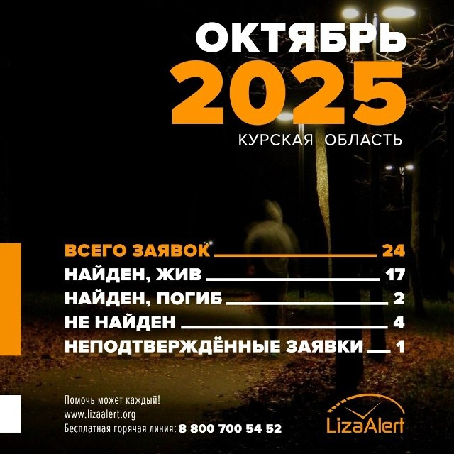 В отряд «ЛизаАлерт» Курской области в октябре поступило 24 заявки Поисковый отряд «ЛизаАлерт» Курской области проинформировал, что в октябре 2025 года поступило 24 заявки на поиск пропавших людей. Из них найдены живыми 17 человек, двое погибли, четверо – не найдены. Одна заявка на подтвердилась. - Поиски тех, кто не найден, продолжаются, - говорится в сообщении.