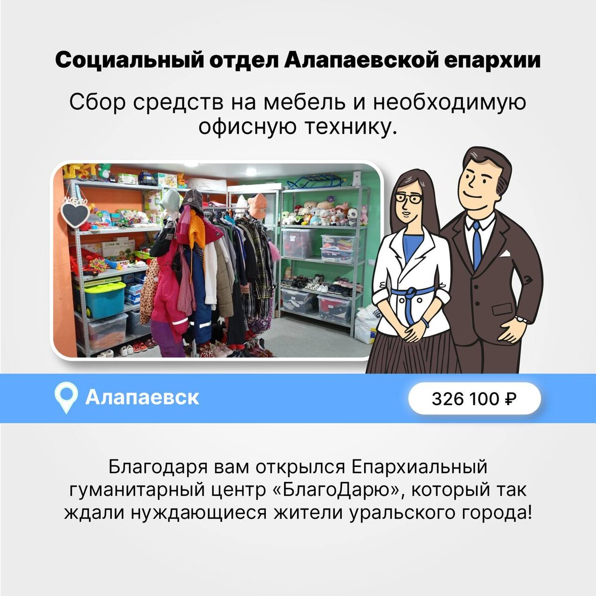 Подробности отчетов и фото можно посмотреть по ссылкам: 🔆 Благодаря вам открылся Епархиальный гуманитарный центр «БлагоДарю», который так ждали нуждающиеся жители уральского города! 🔆 Вы помогли привести в порядок Православный гуманитарный центр и накормили людей, живущих в крайней нужде. @mirom_help – платформа поддержки православной благотворительности «Поможем»