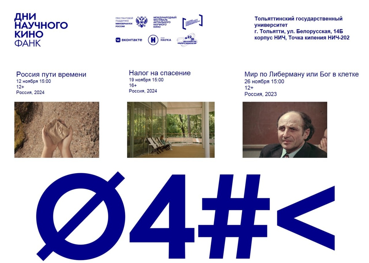 📢 В ноябре в Тольяттинском госуниверситете пройдут Дни научного кино. 12, 19 и 26 ноября на бесплатных киносеансах в Точке кипения ТГУ вы сможете узнать об открытии давно исчезнувших миров, о тайнах человеческих чувств и эмоций, о жизни и научных достижениях одного из основателей биофизики. К показу будут представлены три фильма, выбранных по итогам голосования: 🔹«Россия – пути времени» Регистрация на киносеанс: https://dnk.csff.ru/registry/?eventid=2998 🔹«Налог на спасение» Регистрация на киносеанс: https://dnk.csff.ru/registry/?eventid=2999 🔹«Мир по Либерману или Бог в клетке» Регистрация на киносеанс: https://dnk.csff.ru/registry/?eventid=3000 Организатор показов – Фестиваль актуального научного кино ФАНК при грантовой поддержке Министерства науки и высшего образования РФ в рамках Десятилетия науки и технологий.