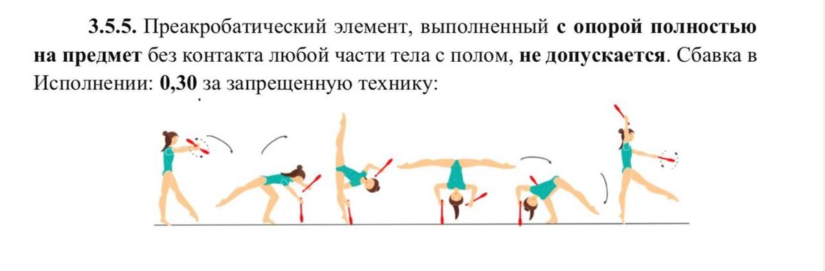 3.5.5.Преакробатический элемент, выполненный с опорой полностью на предмет без контакта любой части тела с полом, не допускается. Сбавка в исполнении 0,3 за запрещенную технику