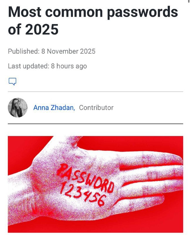 Исследование, проведенное командой из Comparitech, выявило наиболее распространенные пароли в 2025 году. Анализируя около 2 миллиардов паролей, опубликованных на форумах с утечками данных, исследователи выделили несколько самых популярных комбинаций: - 123456 - 12345678 - 123456789 - admin - 1234 - Aa123456 - 12345 - password - 123 - 1234567890 Пароль «123456» оказался на первом месте с ошеломляющим числом использования — 7,6 миллиона раз. Среди более креативных записей встречались слова «minecraft» и «welcome». Интересно, что даже Лувр выбрал не самый простой пароль. Дополнительную информацию можно найти на Cybernews. Постмейкер - автоматическое ведение канала 🤖 Анимация | СhatGPT-4 | Помощь с резюме