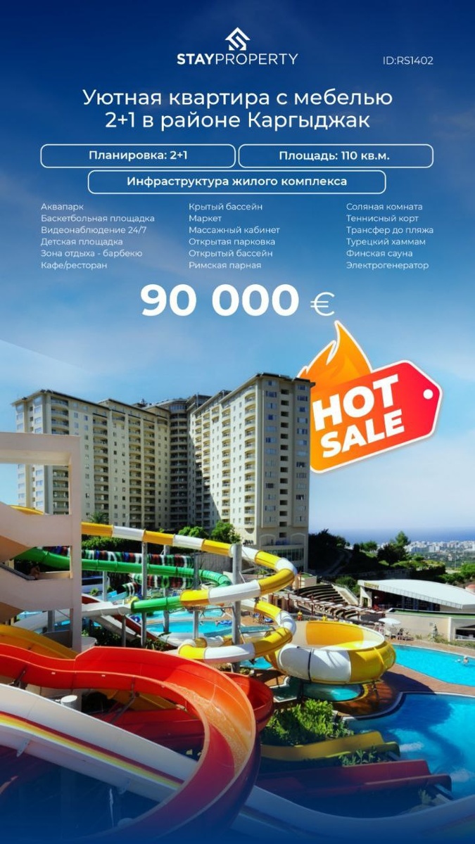 Квартира в комплексе 5️⃣⭐️ с аквапарком! Вид на горы👌🌅Горящая продажа в легендарной резиденции! 🔥€90.000🔥 📍Турция, район Аланьи Каргыджак. 🏖 До моря 3 км, трансфер. Рядом супермаркет Migros. Продается квартира 2+1, площадью 110 м². 5-й этаж, выходит окнами на северную и восточную стороны. ⛰ Великолепный вид на горы! 🛋 Полностью меблирована. На территории отельно-жилого комплекса есть: 🏊 открытый бассейн, 💦 большой аквапарк, 🏊♀️ крытый бассейн, 🕌 турецкая баня, 🔥 финская сауна, 💆♀️ спа-центр, 🌫 паровая баня, 🧂 соляная комната, 💆 массажный кабинет, 👶 детская площадка, 🎮 игровые площадки, 🍽 ресторан, ☕️ кафе, 🛎 рецепция, 🛍 магазин, 🏀 баскетбольное кольцо, 🎾 теннисный корт, 🚁 вертолетная площадка, 🌿 пергола, 🍖 зона барбекю, 🍹 бар у бассейна, ⬆️ лифт, 📡 TV, 🔔 домофон, ⚡️ генератор, 🕛 охрана, 🎥 камеры, 🌱 садовник, 🤵 швейцар, 🚌 трансфер до пляжа 🚗 парковка, множество услуг и сервисов. 🆔RS1402 📷на StayProperty.com 📱 +905362052879 – все мессенджеры.