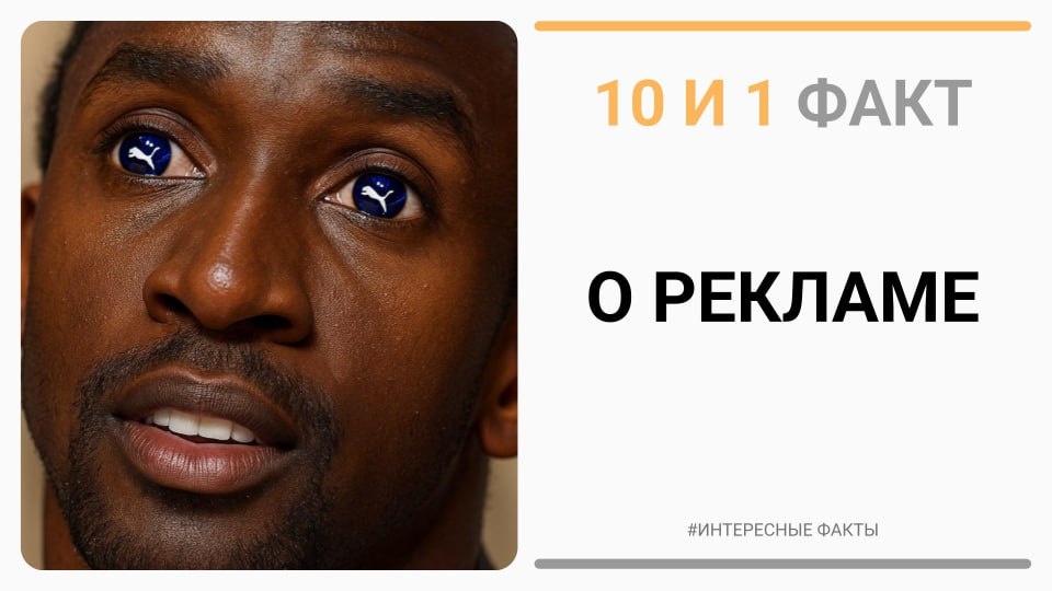 📜 10 и 1 факт о рекламе: 1. Самый древний дошедший до нас рекламный носитель — древнеегипетский папирус, на котором было сообщение о продаже раба. 2. В рекламе часов стрелки всегда устанавливаются на 10:10 или 8:20, чтобы они образовывали «улыбку». 3. Обычно дети-актёры, снимающиеся в рекламе детских товаров, старше своей целевой аудитории, чтобы стать «ролевой моделью» для маленьких зрителей. 4. Самым известным рекламным роликом всех времён считается «The Lucky Strike» для табачной компании Lucky Strike, созданный в 1947 году. 5. Самая дорогая рекламная кампания была проведена для компании Pepsi в 2015 году и стоила 11 миллионов долларов. 6. Самая длинная реклама была создана для компании McDonald's в 2008 году и длилась 10 минут, её показали на Олимпийских играх в Пекине. 7. Самая короткая реклама была создана для компании Coca-Cola в 1919 году и состояла из одного слова — «Coke». 8. Первым «вирусным» рекламным роликом стала «Эволюция красоты» от Dove, раскрывающая «подногот