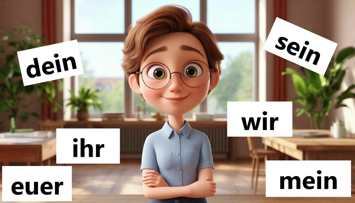 Привет, друзья! 👋 Сегодня мы разберём притяжательные местоимения в немецком языке – это те маленькие слова, которые показывают, кому что принадлежит. 🧸📚 Притяжательные местоимения отвечают на вопрос «чей?» (wessen?) и всегда согласуются с существительным по роду и падежу. Примеры: 💡 Важно: немецкие существительные имеют род: И падеж: именительный, винительный, дательный и т.д. 📌 Совет: Сначала учите именительный падеж, а потом постепенно остальные. 1. Вставьте правильное притяжательное местоимение: 2. Переведите на немецкий: 🎉 Поздравляю! Теперь вы знаете, как показывать чей предмет в немецком языке.
