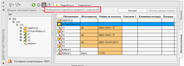 При нажатой кнопке Отображение подробных сведений и соединений на вкладке «Местоположение» «Диспетчера проектов» дополнительно отображаются две панели Подробности и Соединения. На панели Подробности отображается таблица с данными компонентов проекта, в зависимости от того, что выбрано в древовидной структуре проекта (функциональная группа, место или компонент). Таблица используется для просмотра и редактирования несоответствий. Если щелкнуть правой кнопкой мыши по ячейке с названием любого столбца, то отобразится контекстное меню со списком названий столбцов, которые выводятся в таблице Подробности. Перетаскиванием порядок столбцов можно изменять. Щелчком по полю Дополнительно открывается окно «Отображаемые столбцы», в котором выбираются дополнительные столбцы для отображения в таблице Подробности. Щелчком по полю Восстановить параметры по умолчанию для всех столбцов восстанавливаются настройки таблицы Подробности по умолчанию. Если щелкнуть правой кнопкой мыши по любой ячейке таблицы