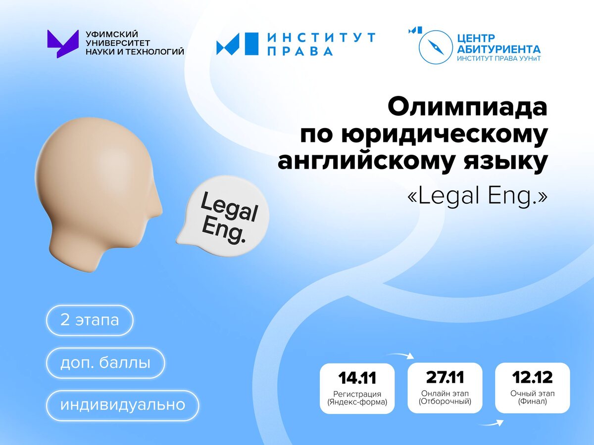 Готов к вызову? Олимпиада по юридическому английскому «Legal Eng.» для будущих лидеров международного права ⚖️ Институт права Уфимского университета науки и технологий объявляет о старте олимпиады по юридическому английскому языку «Legal Eng.» для учащихся 9-11 классов! Почему это круто? Победители и призеры получают дополнительные баллы за индивидуальные достижения при поступлении в УУНиТ! 📈 Как все пройдет? Олимпиада проходит в два захватывающих этапа: 🛜 Отборочный этап (онлайн) - Дата: 21 ноября 2025 г. 🏛️ Заключительный этап (очно) - Дата: 12 декабря 2025 г. - Место: Институт права УУНиТ (г. Уфа, ул. Достоевского, 131). 🚀 Важно успеть! Регистрация открыта до 14 ноября 2025 года включительно! Ссылка для регистрации: https://forms.yandex.ru/cloud/68eff346d04688193c18f5ae Это возможность показать свои знания и получить реальные бонусы для поступления!