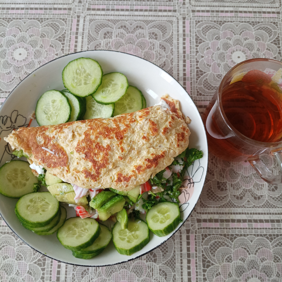 08.11.25. Суббота. Сегодня снова был ранний подъём. Надо долечить мужа. После я не уснула, отредактировала свою статью. Постаралась сократить, но ничего не получилось. Потом уснула ненадолго, в восемь меня разбудил будильник. Я повалялась для приличия, не люблю вскакивать сразу. Встала и принялась готовить завтрак. Завтрак получился почему-то поздний. Загорелось мне приготовить овсяноблин. Он и вкусный и сытный. Пока геркулес набухал в молоке я нарезала всё, что надо для наполнения. Мяса не хочу, рыбу солёную тоже. Приготовила авокадо и крабовые палочки. Смазываю внутри мягким творогом, он вполне заменяет творожный сыр, не такой жирный, а точнее, совсем обезжиренный. Еле уместила наполнитель, нарезала ещё и огурчика. Получилось сытно, высчитала белок, что-то около 25г. Нормально. После завтрака принялась готовить голубцы из листьев мангольда. Еле завернула начинку, листочки маловаты, не выросли. Вид темных листочков не эстетичен, но нас вкус это не влияет. Этим блюдом я ужинала. Под