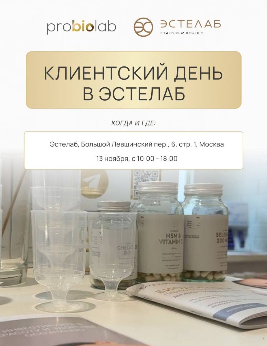 Друзья, приглашаем вас на клиентский день в клинику Эстелаб! Вас ждет: ⚪️ Знакомство с новинками Probiolab ⚪️ Скидки 15% на продукты ⚪️ Розыгрыш подарков для гостей ⚪️ Дегустация наших продуктов Будет очень интересно, ждем вас 😉 Когда и где: 📍Эстелаб, Большой Левшинский пер., 6, стр. 1, Москва 📍13 ноября, с 10:00 - 18:00 #здоровье #эстелаб #probiolab