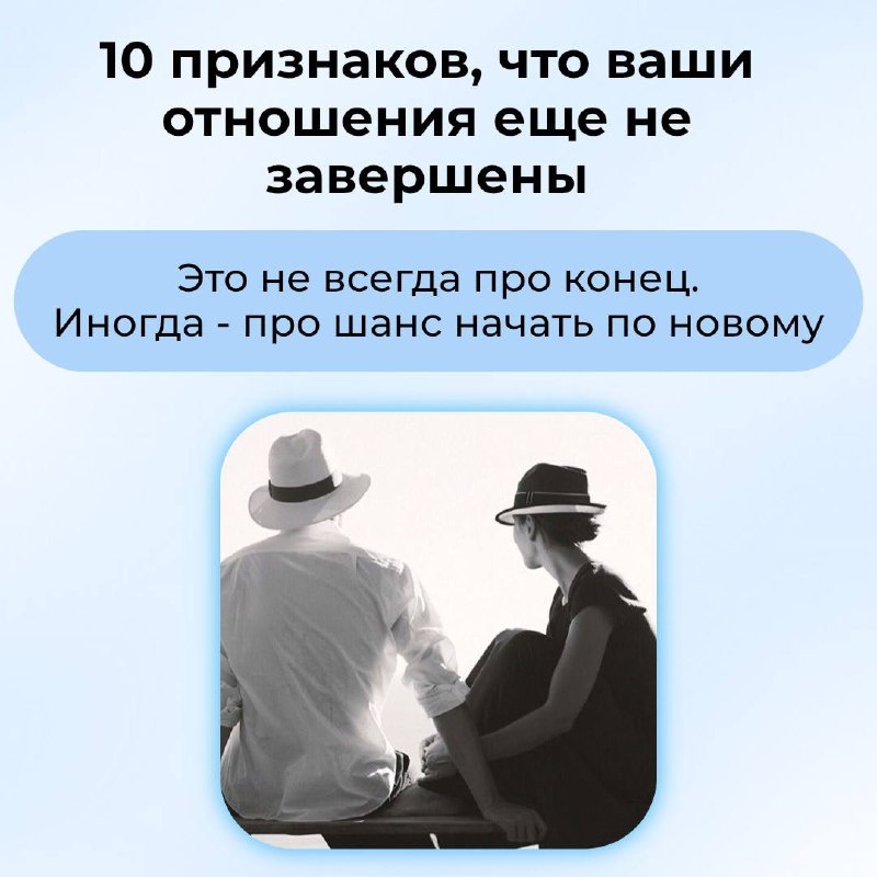 10 признаков, что внутри осталась незавершённость 1️⃣Вы всё ещё мысленно разговариваете с этим человеком. 2️⃣Продолжаете прокручивать, «что нужно было сказать по-другому». 3️⃣Чувствуете тревогу, когда вспоминаете, - даже если прошло много времени. 4️⃣Вас цепляет любое упоминание о нём. 5️⃣Вы ловите себя на желании «случайно» написать или узнать новости. 6️⃣Эмоции всё ещё сильные: злость, вина, сожаление или надежда. 7️⃣Сравниваете всех новых людей с бывшим партнёром. 8️⃣Не можете отпустить вещи, фото, переписки. 9️⃣При виде его имени сердце всё ещё реагирует. 🔟Вам кажется, что разговор «тогда» был не последним. 🟦Если вы нашли себя хотя бы в нескольких пунктах - это не обязательно значит, что «нужно всё забыть». 🟦Иногда это просто сигнал тревоги: не всё прожито, не всё понято, не всё сказано. Иногда - это шанс: 🔵поговорить без упрёков, 🔵честно прояснить, 🔵или увидеть, что история всё же подошла к естественному концу. Главное - не бежать сразу к действию. Сначала - понять, что
