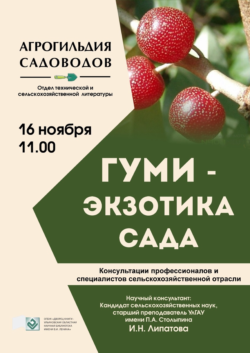 🌳Открываем новый сезон занятий «Агрогильдии садоводов»🌾 📆16 ноября в 11.00 в отделе технической и сельскохозяйственной литературы Дворца книги (2 этаж) состоится осеннее заседание клуба, которое будет посвящено гуми. Этот кустарник сегодня счиатется редким, хотя заслуживает более пристального внимания садоводов. Подробнее: https://clck.ru/3QA9gG
