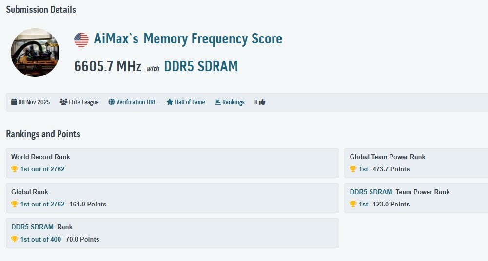 Новые достижения! Говорят, что процессоры Arrow Lake никого особо не интересуют, но именно на них устанавливаются все новые рекорды по разгону памяти. Сегодня на HWBot был зафиксирован рекорд для DDR5 – 6605,7 MHz, что соответствует 13 211 МТ/с. Использовались модули памяти Patriot Viper Xtreme 5, материнская плата GIGABYTE Z890 AORUS Tachyon ICE и процессор Intel Core Ultra 7 265K. На данный момент это максимальная частота DDR5. При этом добиться такого результата очень сложно, поскольку использовался только одноканальный режим и охлаждение жидким азотом. @techogid