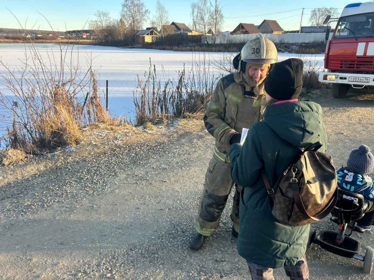 Сотрудник 30 пожарно-спасательной части 9 пожарно-спасательного отряда проводят профилактический рейд в связи с появлением льда на водоемах