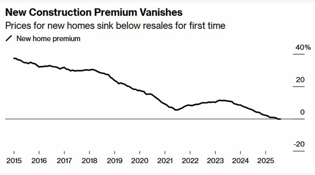 Сегодня из-за проблем на рынке недвижимости местные девелоперы начали предлагать жилищные программы под 1%, но с нюансом — это только на первый год. При этом есть и фиксированная ставка в 3,99% — её предлагает DR Horton Inc., крупнейшая строительная компания США. Так, количество заказов, сделанных впервые, упало на 14% в последнем квартале по сравнению с аналогичным периодом прошлого года. Кроме того, впервые цена на типичный новый дом в июле и августе оказалась ниже, чем на существующий. «Сейчас рынок жилья представляет собой гораздо более серьёзную конкуренцию для застройщиков, чем когда-либо. Существует серьёзное беспокойство по поводу гарантий занятости, учитывая отсутствие найма. К тому же, наступает эпоха искусственного интеллекта»,— заявил Марк Занди, главный экономист Moody’s Analytics. Ранее мы писали более подробно о рынке жилья США в международном обзоре.