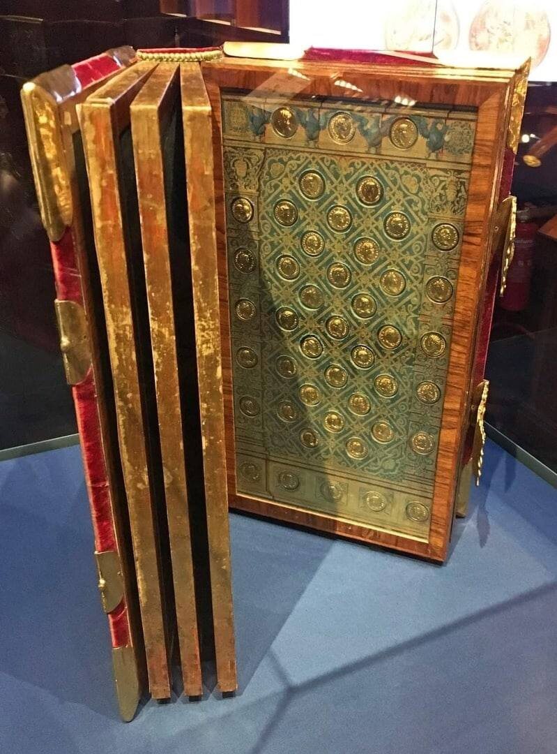 Это первый том четырехтомного Codex Aureus — коллекции римских золотых монет, собранной по приказу императора Священной Римской империи Карла VI Габсбурга (1685–1740). По сути это нумизматический альбом, сейчас он хранится в Музее истории искусств в Вене. Согласно тексту на форзаце, Карл VI издал указ о создании своей монетной коллекционной книги в 1712 году. #truehistory