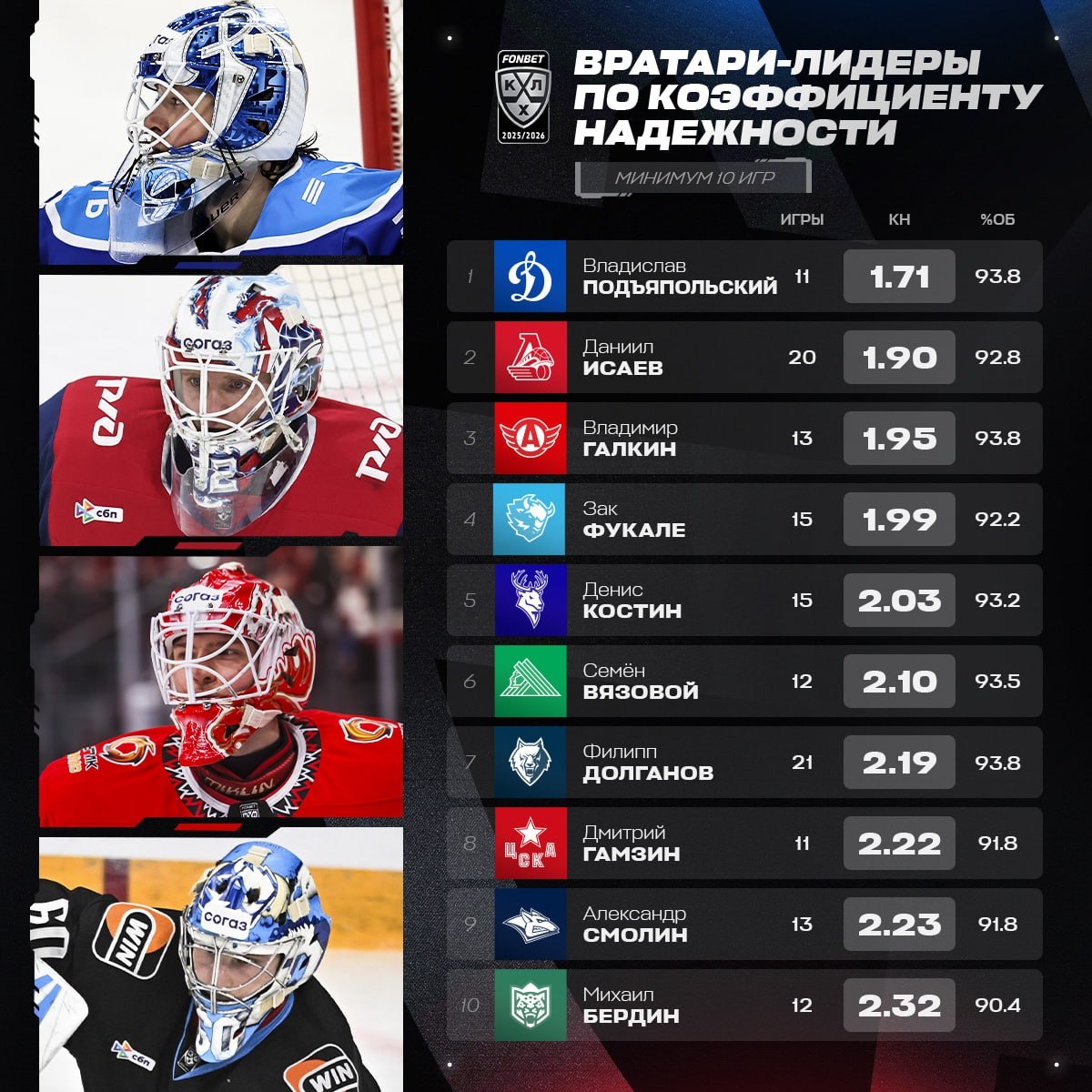 Только четырем вратарям удается пропускать в среднем меньше двух шайб за игру.
