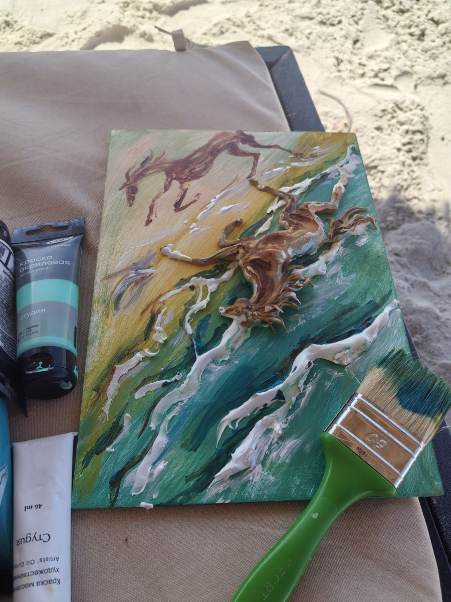 Пробовала сегодня рисовать на пляже 🙌 (ветер уносит всё 😅🤣🤣, нарисовала много и раздала местным раньше чем сфоткала; пришла к выводу, что удобнее рисовать в помещении, где ничего не сдувает 😅, и со штативом для телефона) Мой первый осознанный выбор медиума: рисовала на воде из Карибского моря 🙌