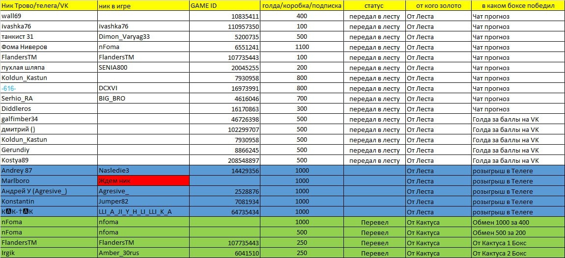 Всем привет! Данные за стрим сформированы. Все, что от Лесты данные направлены, все что от Кактуса золото начислено. Не направлены данные за розыгрыш в ТГ. Ждем ник в танках до вечера воскресенья от Marlboro и направляем в Лесту...