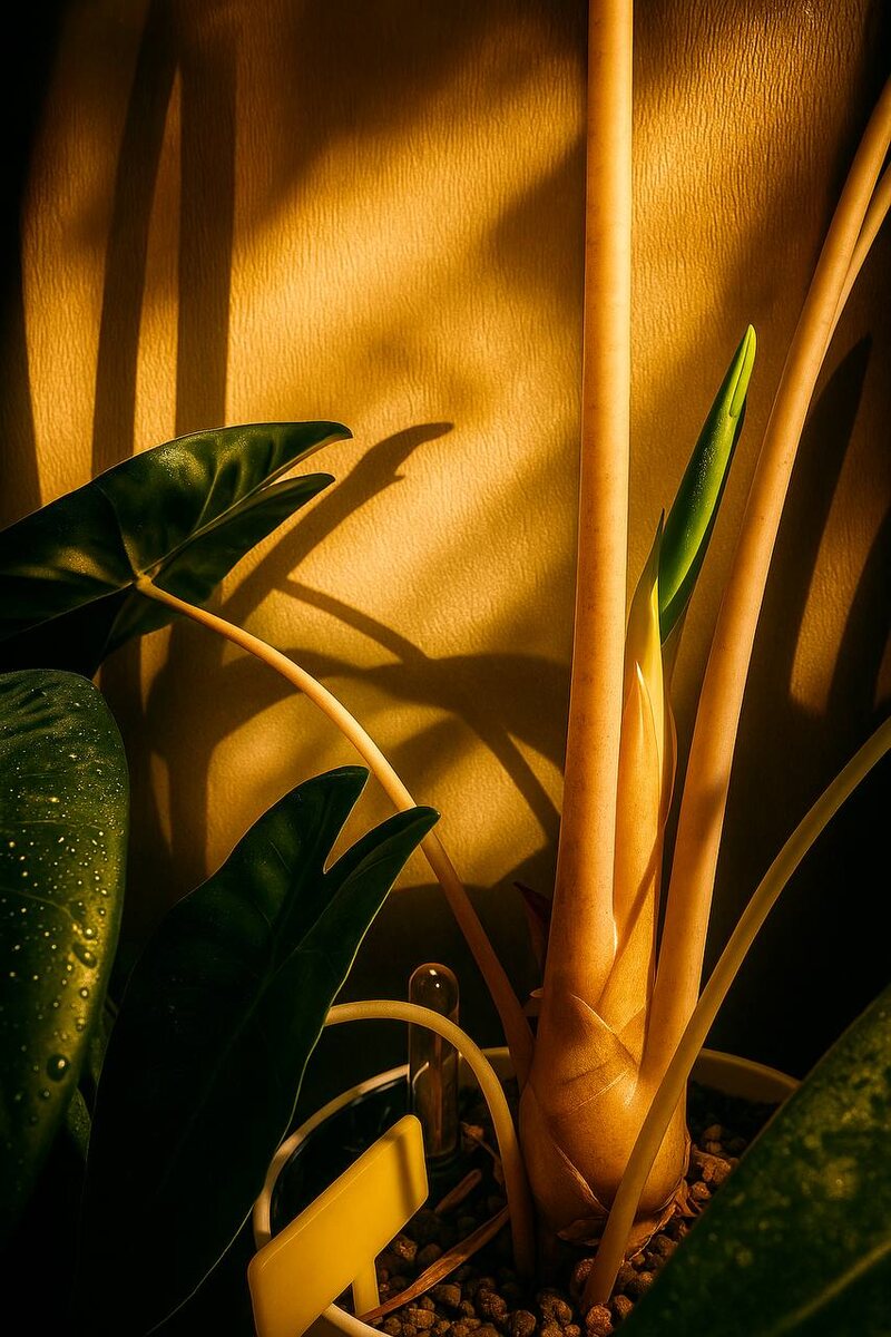 🌿 Алоказия Pink Dragon — тропическая королева с характером 💗🐉 Мой Pink Dragon впервые зацветает — и это настоящее событие! Не каждый день видишь, как алоказия выпускает цветонос: обычно она сосредоточена на листьях, а не на цветении. Эта красавица получила своё имя не случайно — «Розовый дракон» поражает изящными розовыми стеблями, которые словно подсвечены изнутри. Такой оттенок — заслуга антоцианов, природных пигментов, отвечающих за розово-пурпурные тона. Они не только красивы, но и защищают растение от избытка солнца, выполняя роль природного фильтра. Листья у Pink Dragon крупные, с глянцевой поверхностью и чёткими прожилками — почти зеркальные, с контрастом между тёмно-зелёной листвой и светлыми жилами. На ощупь плотные, с бархатным отблеском. Цветок же у алоказии — не яркий и не броский, как у антуриума. Он представляет собой соцветие-початок, окружённое нежной зеленовато-белой покрывалкой. Пахнет он довольно своеобразно — лёгкий, слегка пряный аромат, напоминающий смесь т