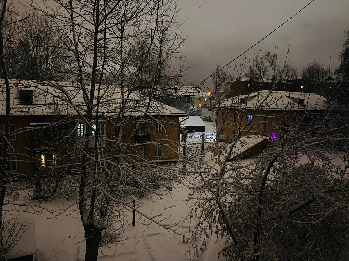8-9 ноября 2025. Выходные. Совсем я с этими выходными выбилась из режима. Просыпаться стараюсь не позже 10:00 утра, а вот с отходом ко сну беда. Какой день лежу и смотрю в потолок до 3-х часов ночи. Вчера даже уже не старалась уснуть, думки о сне только сильнее раззадоривают и отгоняют его куда подальше. Погода в выходные была… Снег, снег, снег… Он шел утром, днем, вечером и ночью. Всё покрылось толстым слоем из белых пушистых снежинок. Дороги, дома, машины, деревья, провода… Но зато посмотрите какая красота. Фотография сделана в 00:30 ночи. На улице стоит умиротворение. Тихо, светло и тепло. Появилось жуткое желание выйти погулять. Но страх встретиться ночью с нехорошими людьми запер дома. Зато днем оторвались по полной. Собрались всей семьей и отправились на прогулку. Поддались общегородской забаве и слепили снеговика. У нас в городском паблике даже отдельный пост создали, под которым томичи делились фотографиями своих снеговиков. Прислали около ста фотографий, а это ещё сколько о нё
