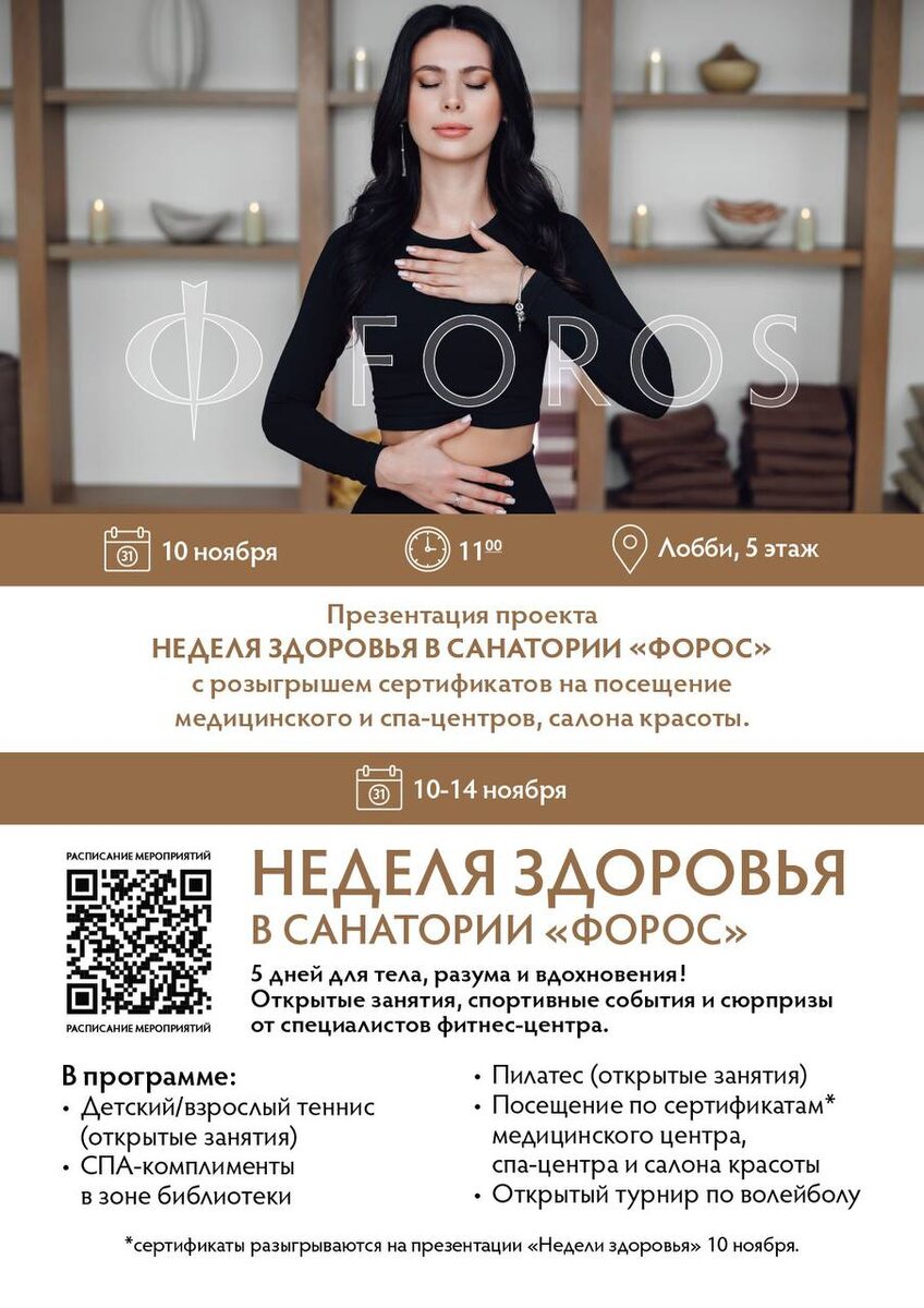 🌿 Неделя здоровья в санатории «Форос»! Приглашаем вас на презентацию "Недели здоровья" 📅10 ноября в 11:00 в Лобби-баре (5 этаж) Вас ждёт вдохновляющая встреча, где мы подробно расскажем о программе мероприятий и проведём розыгрыш сертификатов на посещение медицинского центра, SPA и салона красоты. На неделе здоровья вас ждут: - открытые занятия по пилатесу и теннису; - SPA-комплименты в зоне библиотеки; - открытый турнир по волейболу; - посещение по сертификатам медицинского центра, SPA и салона красоты; - сюрпризы и вдохновляющие активности от специалистов фитнес-центра. 💫 5 дней для тела, разума и вдохновения — присоединяйтесь к «Неделе здоровья» и почувствуйте гармонию с собой! 📅 Не забудьте: сертификаты будут разыгрываться ТОЛЬКО на презентации 10 ноября в лобби (5 этаж).