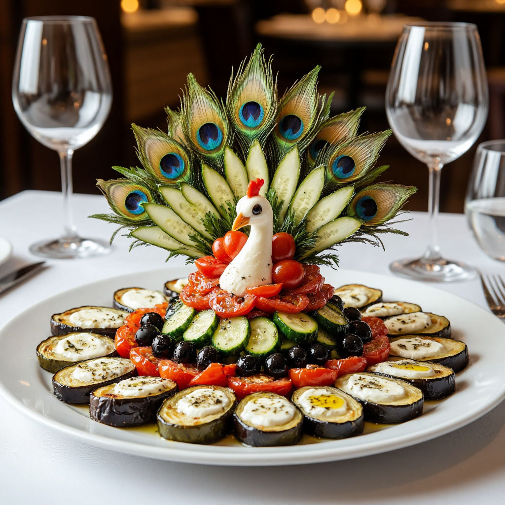 Ну, в общем, заказали мы этот загадочный «Хвост ». Приносят — и мы чуть не упали! На тарелке — настоящая птица! Хвост настоящий, перья из огурцов, туловище из моцареллы, глазки из маслин. Ну чисто Ван Гог, только съедобный! Мы с мужем переглянулись: «Это… точно можно есть?»