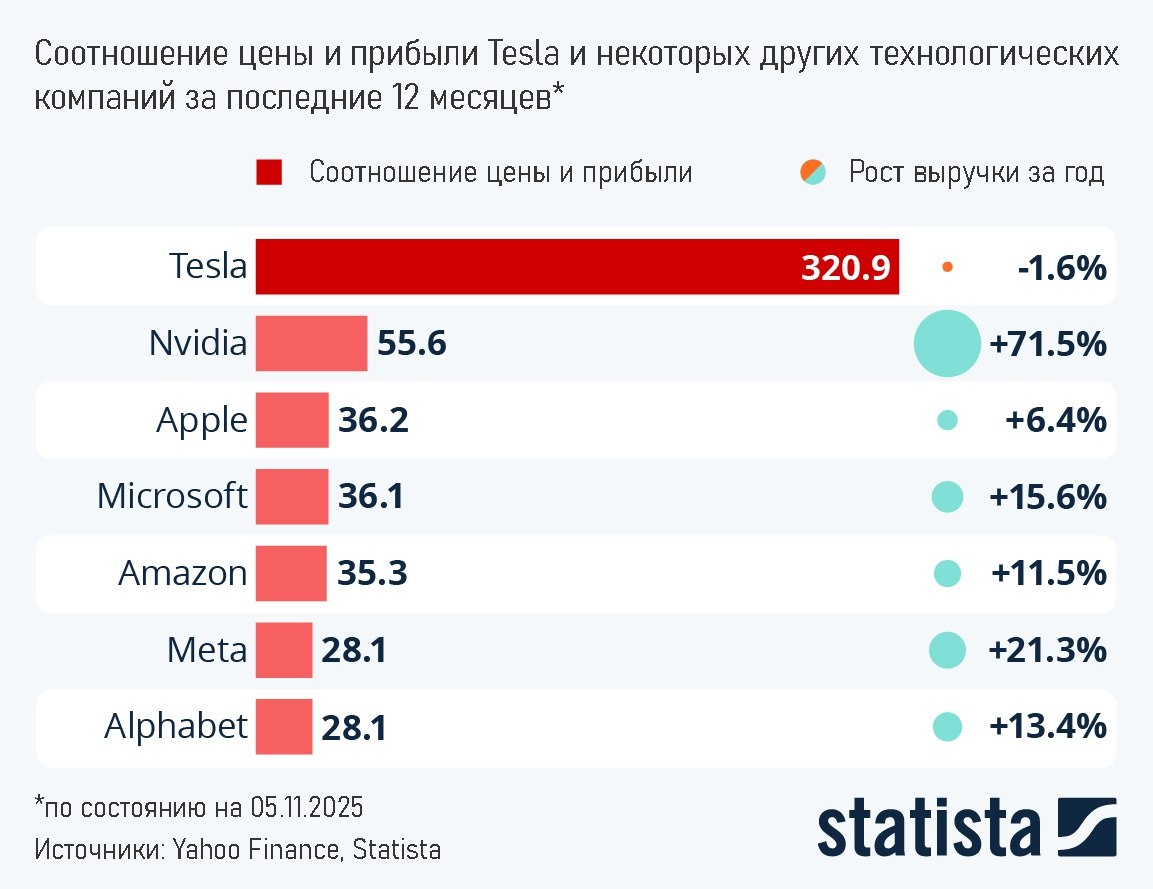 Чей пузырь больше? Куда движется Tesla? Рыночная капитализация Tesla составляет ~$1,5 трлн. Для получения вознаграждения в $1 трлн Илону Маску необходимо увеличить её более чем в 5 раз — до $8,5 трлн. Да, с 2019 года капитализация Tesla выросла в 20 раз, но повторить такой рост сейчас практически невозможно (на старте процентный рост всегда выше, как показали в статье про Apple). Рыночная капитализация Tesla за последние 12 месяцев более чем в 300 раз превышает её прибыль (коэффициент P/E). Для сравнения — у самой дорогой компании в мире Nvidia коэффициент P/E составляет ~55 при капитализации ~$5 трлн (тот ещё пузырь). При этом Nvidia хотя бы показывает рост выручки на 72% за 4 квартала. Выручка же Tesla снизилась почти на 2%. Кроме того, продажи электромобилей Tesla замедлились (и это без учёта отмены льгот в США), а конкуренты сократили технологическое отставание (а где-то даже и превзошли её). Негативное восприятие Илона Маска в Европе и США, многим из которых надоело его непр