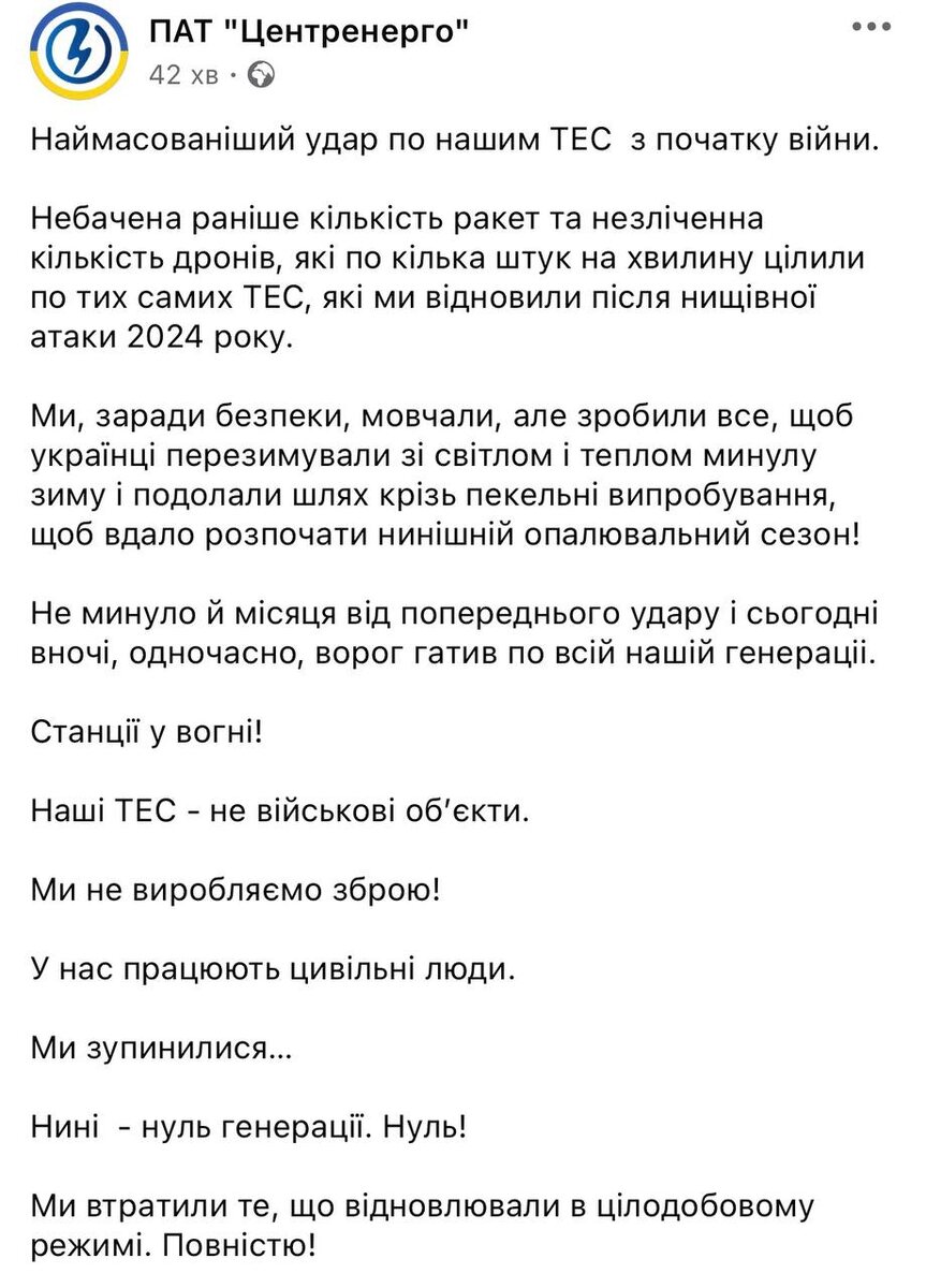 ❗️Все государственные ТЭС Украины остановлены, генерация отсутствует, сообщает госкомпания «Центрэнерго» Подписаться на канал | 📲 MAX Мы в ВКонтакте