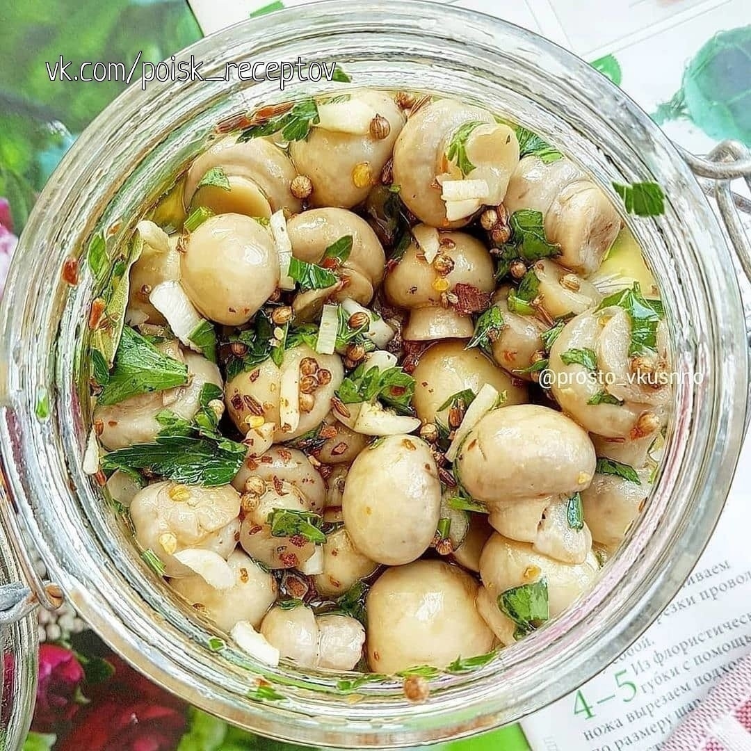 Остренькие, хрустящие, очень вкусные!! Рецепты Лучшие рецепты тут 👇🏻 Ингредиенты: Шампиньоны - 300-400гр. мелкие. Маринад: Чеснок (мелко нарезать)— 3 зуб. Соевый соус — 1 ст. л. Масло оливковое — 4-5 ст.л. Уксус — 3 ст. л. Лист лавровый — 2 шт Тмин — 1/2 ст. л. Кориандр - щепотка. Перец красный жгучий сухой — 0.5 ст л. по вкусу) Зелень (петрушка) — по вкусу Соль (по вкусу) Перец черный свежемолотый (по вкусу) Приготовление: Отвариваем мелкие шампиньоны в подсолненой воде 15 мин. Смешиваем ингредиенты для маринада. Откидываем грибы на дуршлаг, даем стечь лишней воде. Смешиваем все и оставляем мариноваться часов на 12 в контейнере или банке в холодильнике.