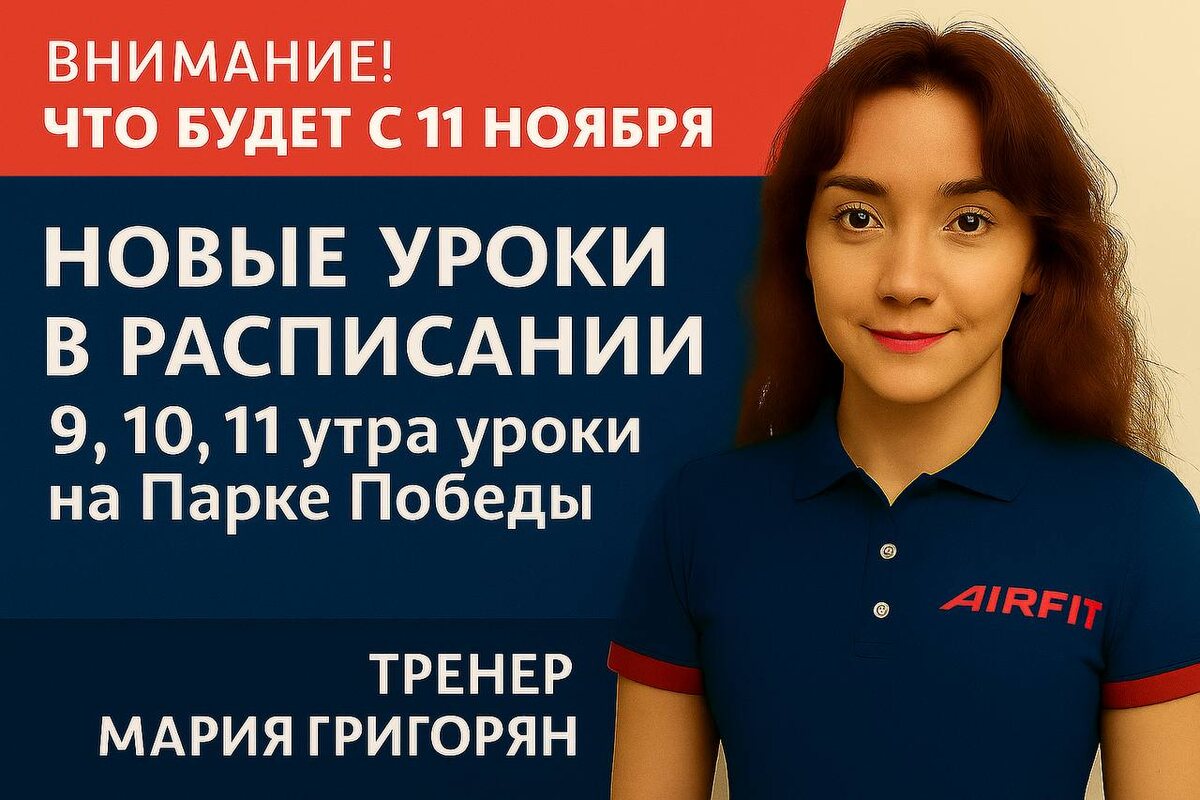 🎯 С 11 ноября — новые утренние уроки на Парке Победы! Теперь в расписании: 🕘 09:00 и 10:00 — уровень Beginner (начальный) 🕚 11:00 — уровень Advanced (продвинутый) 📍 Локация: Парк Победы 👩🏫 Тренер: Мария Григорьян ⸻ О тренере Мария — специалист с большим опытом в фитнесе и движении тела, работает с 2013 года. 📚 Образование: — ВятГГУ — педагог по физике и информатике — Колледж имени Бена Вейдера — инструктор фитнеса и групповых программ — Национальный университет фитнеса — управление фитнес-клубом 🎓 Повышение квалификации: — Airyoga — йога в воздухе — Kangoo Jumps — Kangoo Power, Discovery — Anatomy Study — миофасциальный релиз (МФР), анатомия — Федерация фитнес-аэробики — степ-аэробика, уровень 2 — Pilates Institute — Matwork — Динамическая гибкость 3D, мануальный стретчинг — KinesioPro — МФР — Антон Шапочка — «Квест по телу. Myth Busters» ⸻ 💬 Формат тренировок сочетает работу на реформере, динамику и контроль тела. Занятия подойдут как для начинающих, так и для тех, кто
