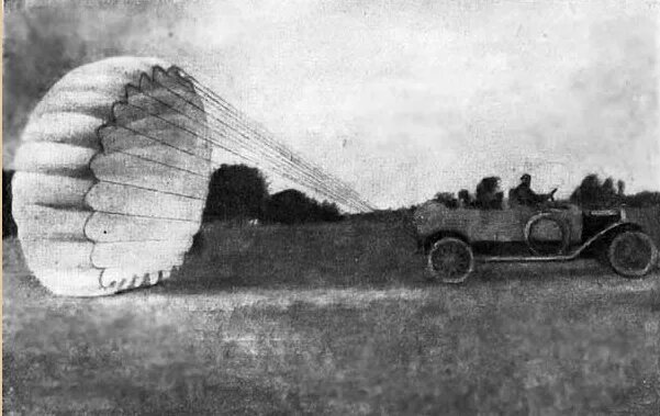 2 июня 1912 года состоялось первое испытание с автомобилем. Машину разогнали, Котельников дернул за спусковой ремень, парашют мгновенно раскрылся, его сила торможения была такова, что двигатель просто заглох. Воздушный тормоз, который позже применили на самолётах и гоночных машинах, был рождён!