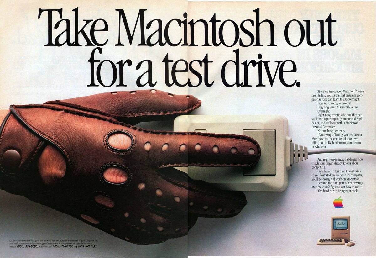 8 ноября 1984 года: Столкнувшись с разочаровывающими продажами своего революционного компьютера, генеральный директор Apple Джон Скалли создаёт маркетинговую кампанию «Тест-драйв Макинтоша» (Test Drive a Macintosh), чтобы убедить людей дать новой машине честный шанс. Стратегия продвижения была прямолинейной: потенциальные покупатели должны были зайти в местный магазин и «одолжить» Macintosh на 24 часа. Замысел заключался в том, что за время использования клиенты привяжутся к компьютеру эмоционально и поймут, что не могут без него обойтись. Хотя около 200 000 потенциальных покупателей воспользовались предложением, дилеры Apple абсолютно ненавидели эту кампанию. Скалли разработал инициативу, чтобы помочь скептичным пользователям разобраться с революционной машиной Apple, которая вышла на рынок в начале того же года. Многие люди никогда не видели графический интерфейс, не работали с мышью и не пользовались компьютерами, отличными от IBM. Кампанию сопровождали несколько запоминающихся теле