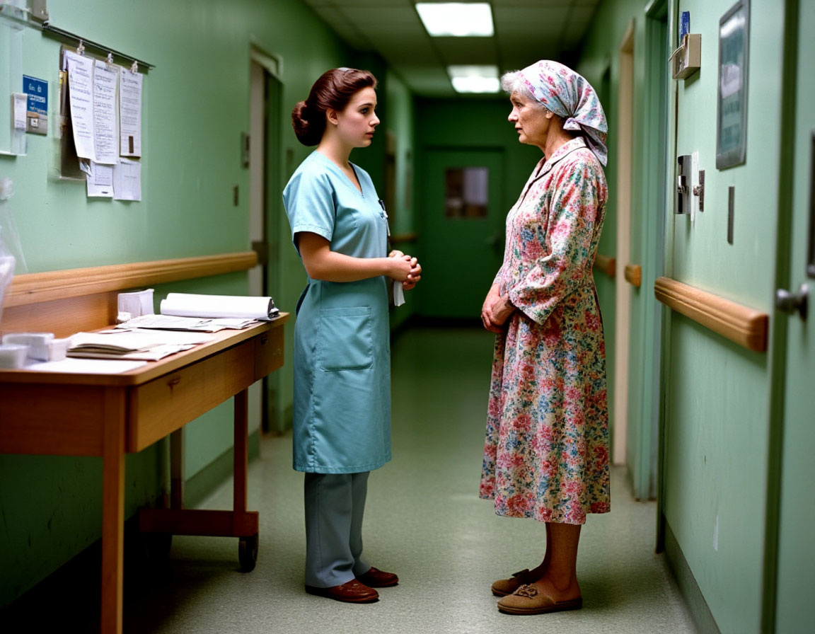 Тем временем, медсестра ушла. Через некоторое время она вернулась к своему столу с худощавой женщиной среднего роста. А больничном халате, больничных тапочках, с седыми волосами, выглядывающими из-под косынки, женщина спокойно слушала медсестру, кивала головой и застенчиво улыбалась.