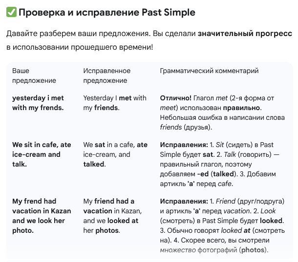 Словообразование и порядок слов: Иногда вы смешиваете части речи (например, "mane" вместо "name") или неверно формулируете фразы (например, "frends провели отпуск").
