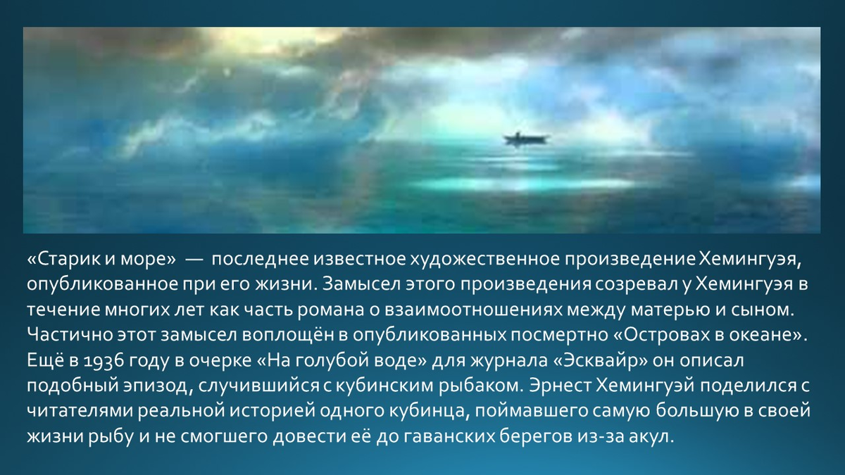 «Старик и море» (The Old Man and the Sea) — повесть американского писателя Эрнеста Хемингуэя, опубликованная в 1952 году. Это одно из самых известных произведений автора, удостоенное Пулитцеровской премии (1953) и сыгравшее ключевую роль в присуждении Хемингуэю Нобелевской премии по литературе (1954). Книга стала символом стойкости человеческого духа и глубоким размышлением о природе борьбы, достоинства и поражения.