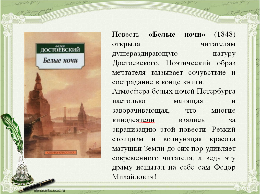 «Белые ночи» — лирическая повесть Фёдора Михайловича Достоевского, написанная в 1848 году и опубликованная в журнале «Отечественные записки». Это одно из самых поэтичных произведений раннего периода творчества писателя, где на фоне романтических белых ночей Петербурга разворачивается тонкая психологическая драма одиночества и несбывшейся любви.