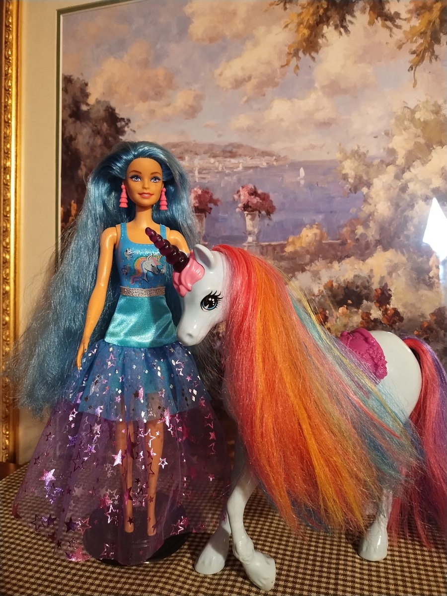 Всем доброго дня! Многие уже отметились в челенже "Цветновласка". Вот и я решила поучастововать. Только кукол Барби с цветными волосами уменя очень много, может сделаю их общую фотосесиию. А сегодня я хочу показать небольшой сюжет с необычной куколкой, которая мне очень нравится. Это Барби - Единорог. Unicorn Barbie. У которой есть и свой настоящий Единорог. И они просто создают такую сказочную пару, что не сделать сюжет о них было невозможно. У меня только долго не было подходящего фона, а вчера я купила картину, ну вот сюжет и сложился. Мне все понравилось, - надеюсь, вам тоже. Встречайте- Барби с Единорогом: У этой куклы просто изумительно красивые темно-синие яркие волосы. Поэтому она, конечно- Цветновласка. А еще у нее синий купальник с нарисованым Единорогом. Который выглядит точно так же, как ее настоящий Единорог. Густая грива цвета радуги - вот какая красивая сказочная лошадка! Барби очень любит свою красавицу! А Единорог любит свою хозяйку. Несколько ярких кадров с самой