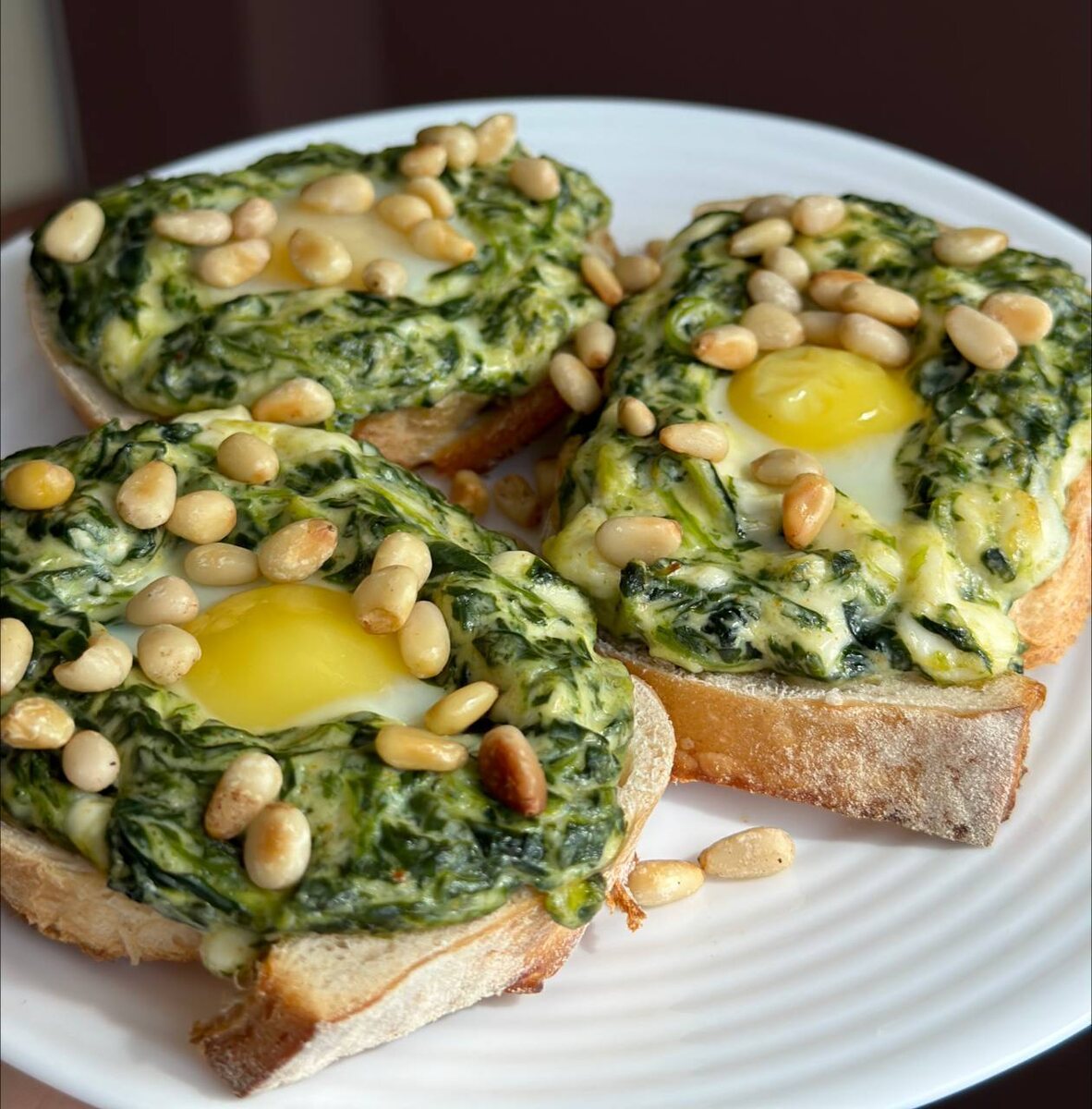 Тосты с перепелиными яйцами и шпинатом🌱 Готовится проще, чем может показаться на первый взгляд. Нам очень зашли👌 Уже не раз готовила. Ингредиенты: 🥚 Шпинат — 100 г 🥚 Творожный сыр — 4 ч.л. 🥚 Перепелиные яйца — 4 шт 🥚 Бездрожжевой хлеб — 2 ломтика 🥚 Кедровые орешки — 5 г 🥚 Оливковое масло — 1 ч.л. 🥚 Зелень, соль, перец — по вкусу Как готовить: 1. На сухой сковородке обжарьте кедровые орешки. 2. Обжарьте шпинат 5 минут на сковороде с маслом. 3. Смешайте шпинат с творожным сыром, посолите. поперчите. 4. Намажьте на ломтики хлеба. 5. Сделайте углубления и вбейте по 2 яйца в каждый тост. Если кусочки хлеба маленькие, то по одному яйцу. 6. Запекайте в духовке при 180°C 10–15 минут. 7. Готовые тосты посыпьте орешками и зеленью. Это, конечно, завтрак не на каждый день, но иногда можно для разнообразия😀👌 #завтрак #яйца