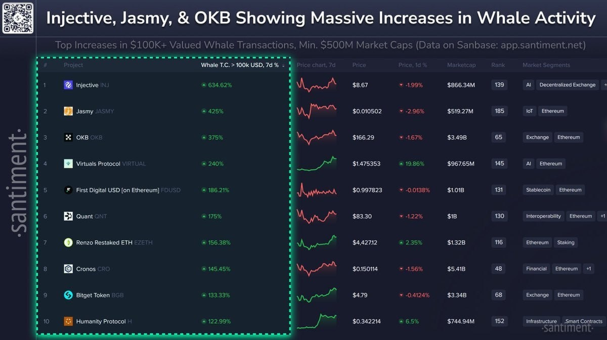 Santiment представил обзор самых активных токенов среди крупных держателей за прошедшую неделю
