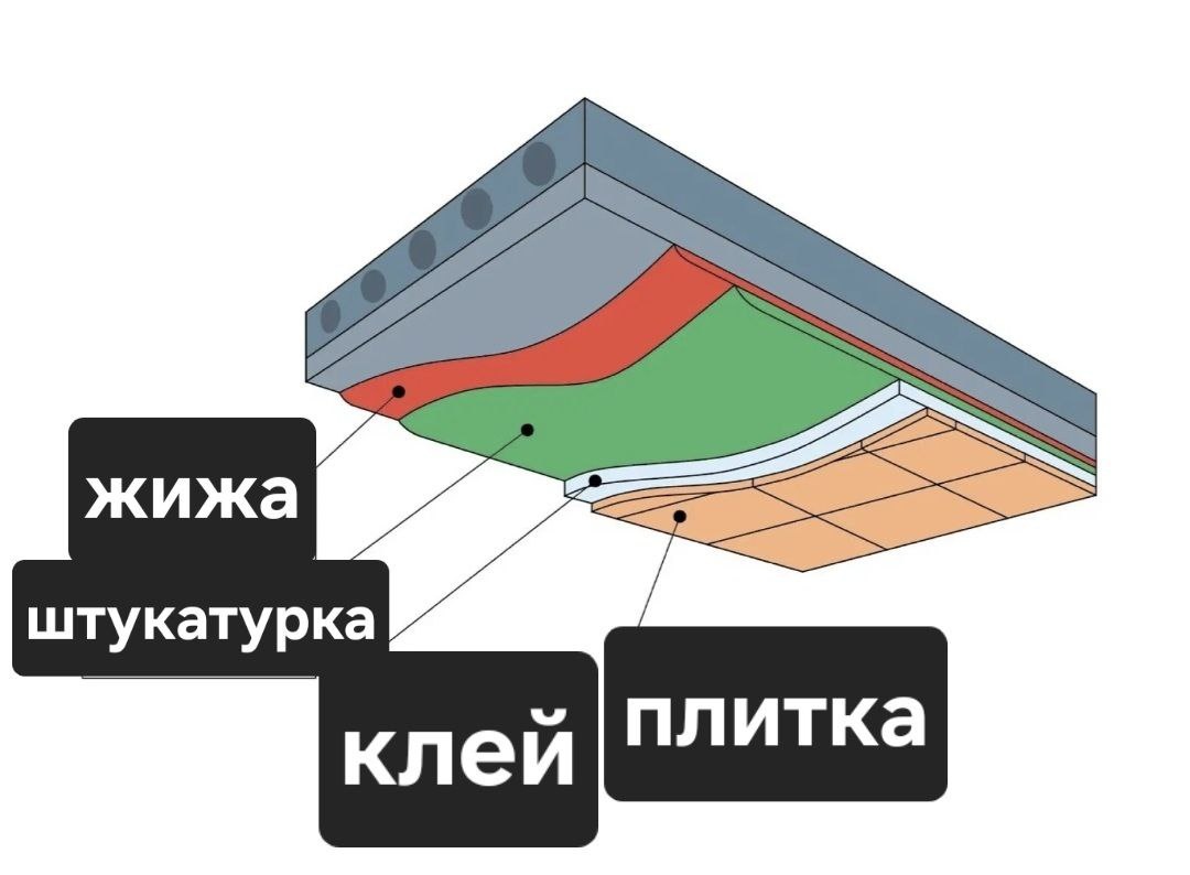 Для надежной облицовки Потолка Керамогранитом, достаточно обеспечить все технологические слои: