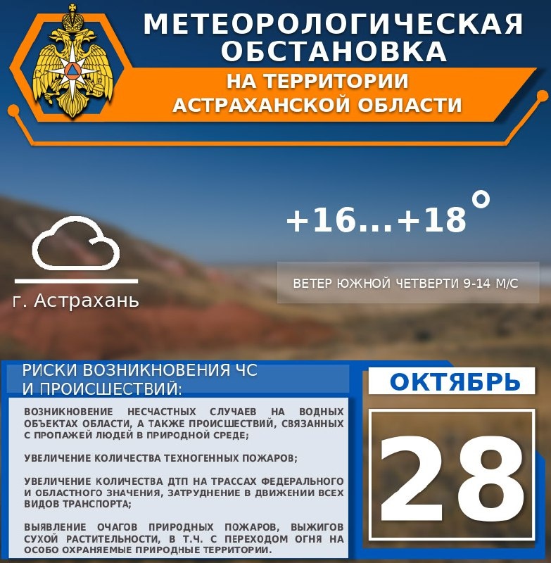 🍂Метеорологическая обстановка на 28 октября ☁️На территории области облачно. ☔️Местами небольшой дождь. 😶🌫️Утром местами туман. 🌬Ветер южной четверти 9-14 м/с.🌡 Температура воздуха +14..+19°. ☁️По г. Астрахань облачно. Без существенных осадков. 😶🌫️Утром туман. 🌬Ветер южной четверти 9-14 м/с. 🌡Температура воздуха +16...+18°. ✅Присоединяйся к МЧС Астрахань 👉🏼Подписывайся на МЧС России в Telegram | MAX