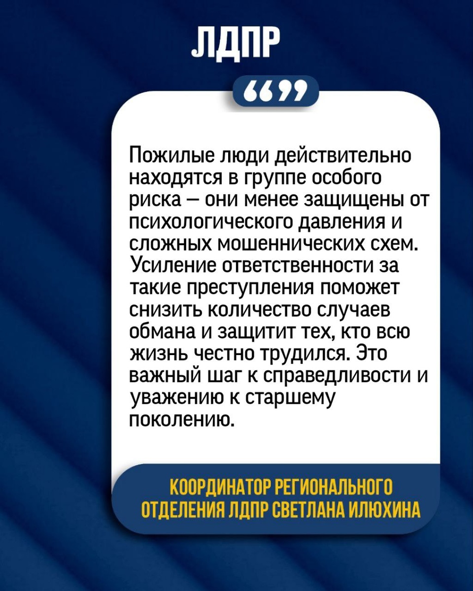 🟡 «Пожилые люди — самая уязвимая группа населения для мошенников. Им трудно противостоять изощрённым схемам жуликов. Наша задача — прекратить этот беспредел в отношении заслуженных людей, которые всю жизнь честно трудились на благо страны», — подчеркнул Председатель ЛДПР Леонид Слуцкий.