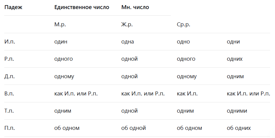 Числительное «один» склоняется как прилагательное в единственном числе, имея формы рода и числа: