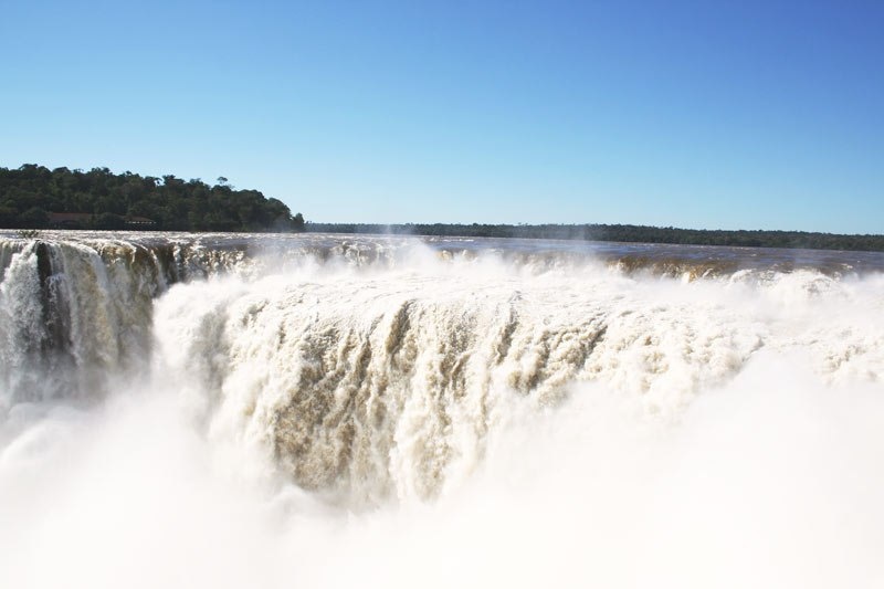 Главной жемчужиной водопадов Игуасу по праву считается «Глотка Дьявола». Это величественное природное явление: могучие водяные потоки шириной 150 метров обрушиваются с 82-метровой высоты, создавая знаменитую подковообразную форму.
