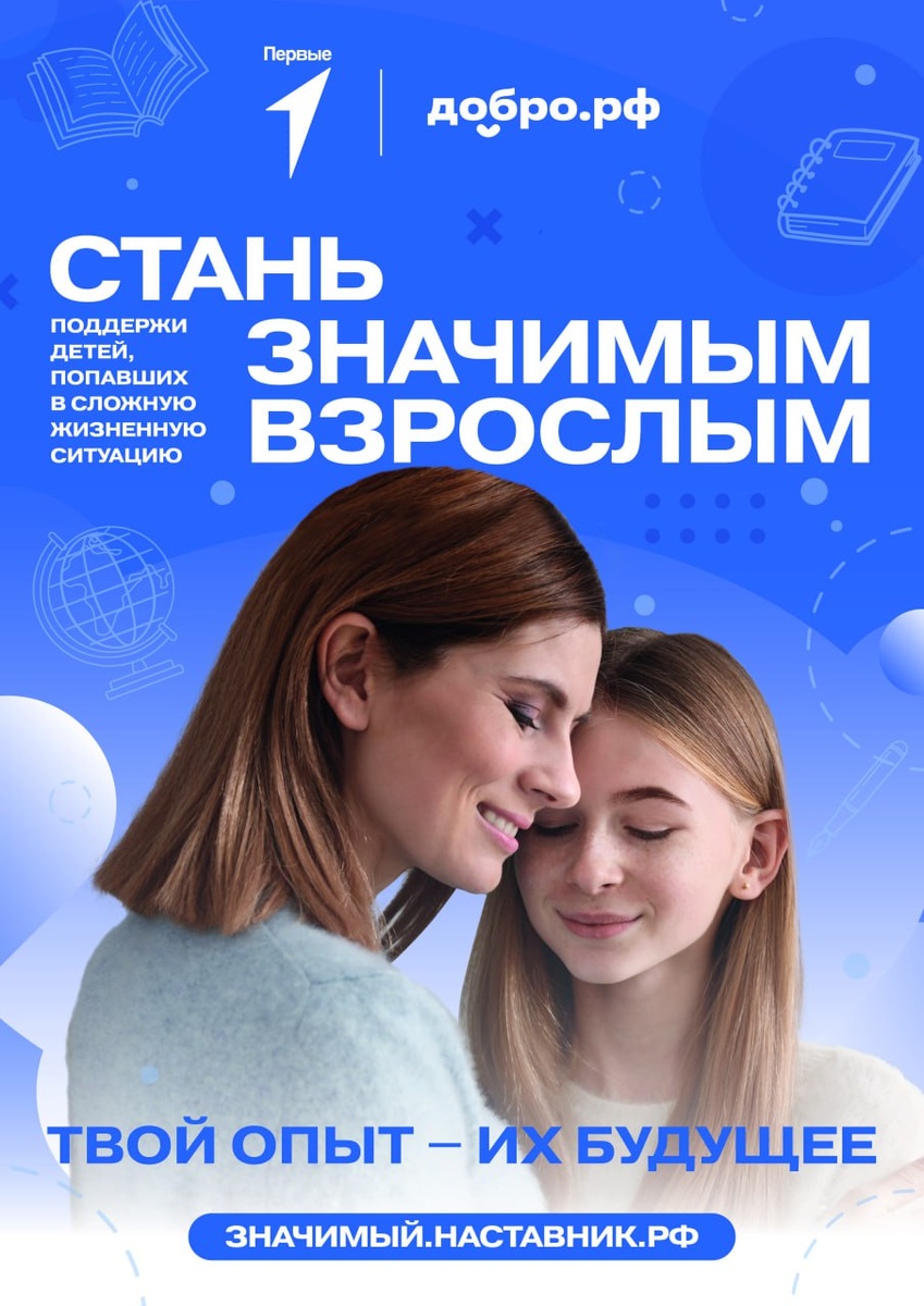 Движение Первых вместе с Добро.рф реализует проект «Значимый взрослый» Каждый, у кого есть время, опыт и желание ими поделиться может стать наставником проекта «Значимый взрослый». Все кандидаты в наставники проходят подготовку: – онлайн-формат обучения – видеокурс с получением сертификата по итогам успешного прохождения; – очная подготовка – индивидуальная консультация наставника с психологом, групповые очные тренинги для наставников на базе местных и региональных отделений Движения Первых. Переходи по ссылке! Там можно узнать больше о проекте и подать заявку. Проект реализуется Движением Первых и Добро.рф при поддержке Минпросвещения России и Росмолодёжи.