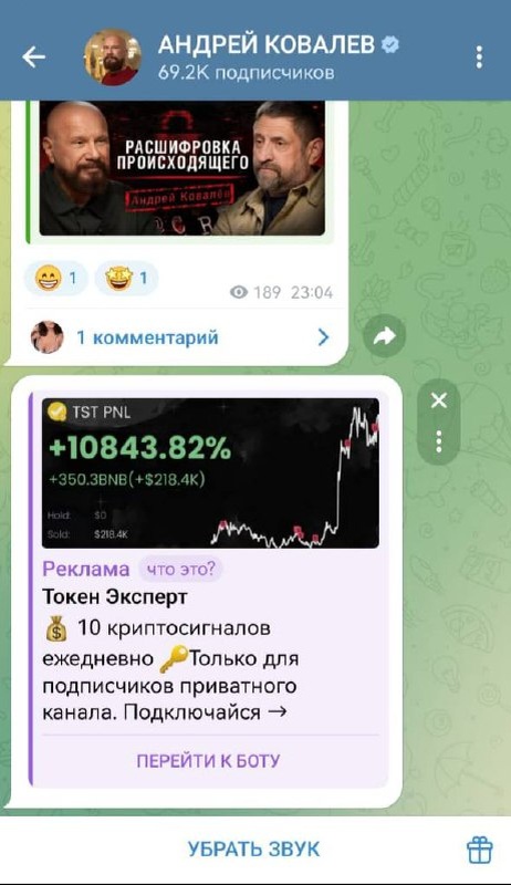 Посмотрел как-то свой телеграм-канал с другого телефона. Оказывается, сам телеграм у меня в канале жульё всякое рекламирует! Не вздумайте на это жульё подписываться и туда заходить! Упаси Господь еще кто-то подумает, что я жульё рекламирую! Обсудим в комментариях! - Приглашаю вас в усадьбу Гребнево на мои ближайшие мероприятия: •15 ноября в 15:00 - Бизнес-встреча Андрея Ковалёва •6 декабря в 15:00 - Итоговая бизнес-встреча ✅ АНДРЕЙ КОВАЛЕВ | reformator.ru | oodp.ru